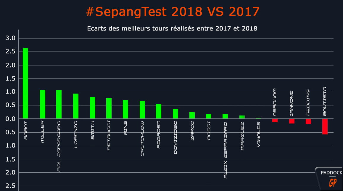 La plus belle progression est à porter au crédit de Tito Rabat, 2,642 secondes plus rapide cette semaine qu’aux tests de la saison passée. Bien sûr, classé dernier en 2017, la tâche pouvait sembler facile pour l’Espagnol, mais…