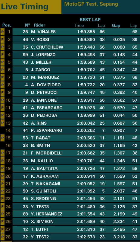 Cinq minutes plus tard, Valentino Rossi produit son effort et allume trois partiels en rouge pour inscrire un 1’59.390 en haut du tableau, soit le meilleur temps de ces deux premières journées d’essais.
