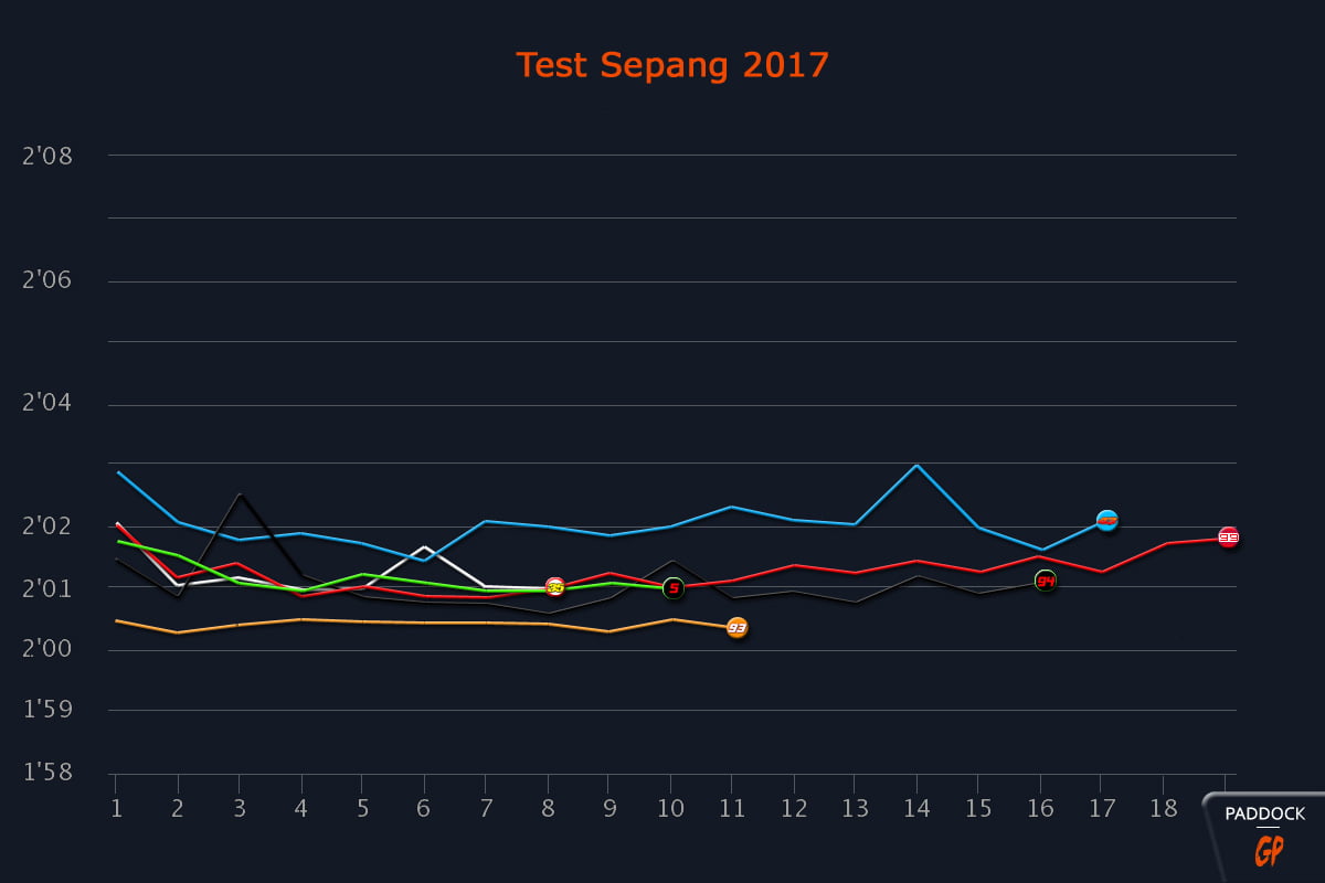 Nous avons donc regardé ceux qui, lors de la dernière journée, ont réalisé au moins 8 tours d’affilée, et, bons princes, nous avons même éliminé ce qui ressemblait à un tour légèrement raté, comme ce fut le cas pour Alex Rins (2’03.758), Jack Miller (2’06.383), Andrea Dovizioso (2’02.095) et Johann Zarco (2’02.409).