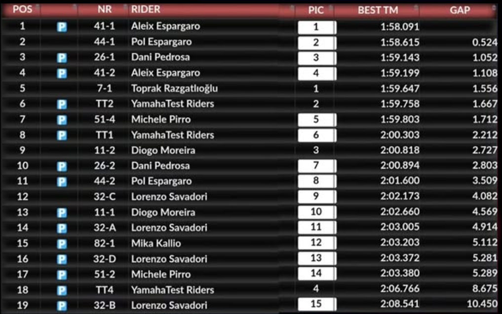 Ce samedi, dernier jour de la première salve, le rythme est monté d’un cran chez les frères Espargaro, puisque l’aîné, sur sa Honda, a tourné en 1’57.173 devant son frère Pol sur sa KTM.