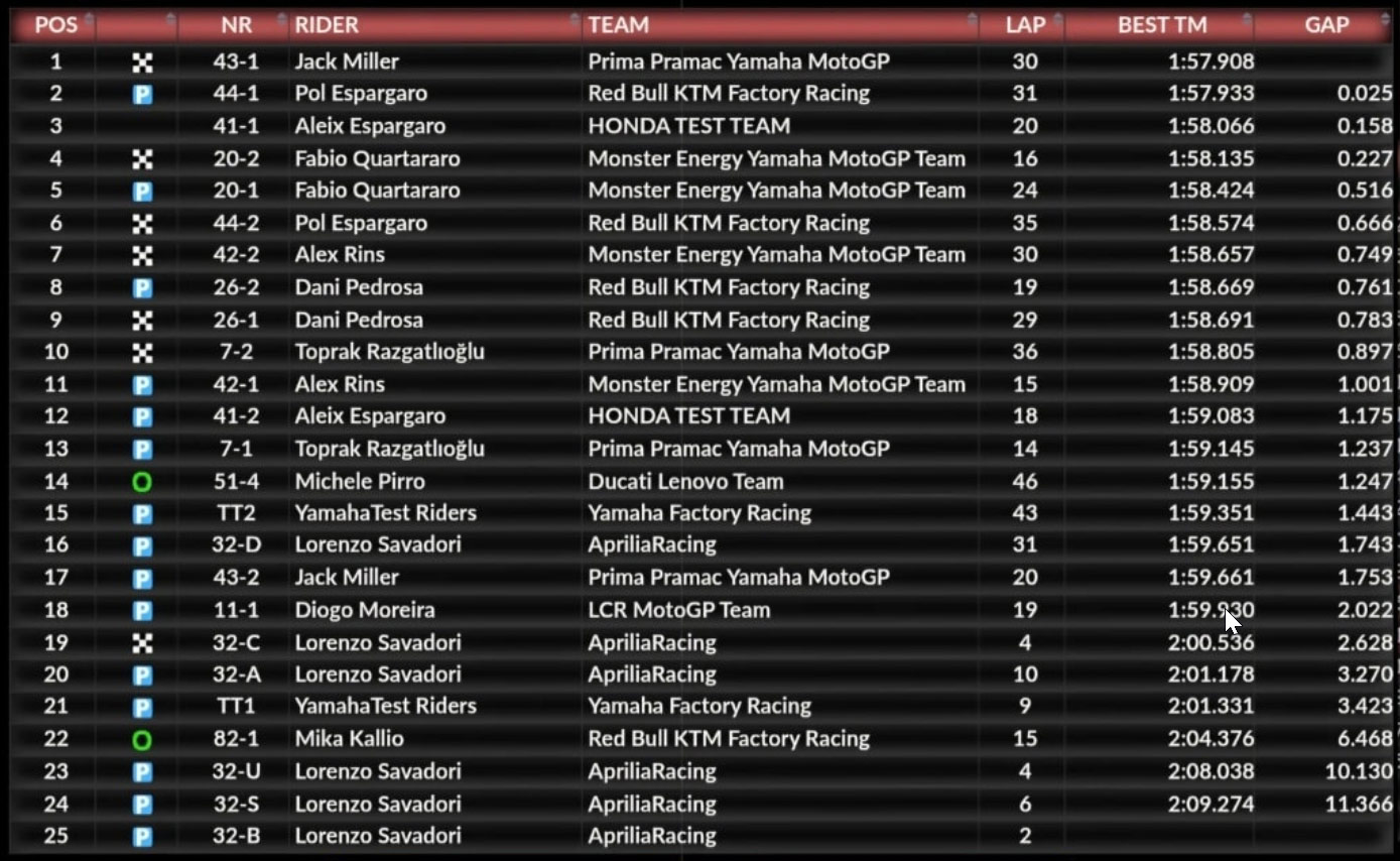 Juste derrière, à seulement 0,126 seconde, on trouve le benjamin de la fratrie de Granollers, Pol Espargaro en 1’57.299 au guidon de la KTM RC16.