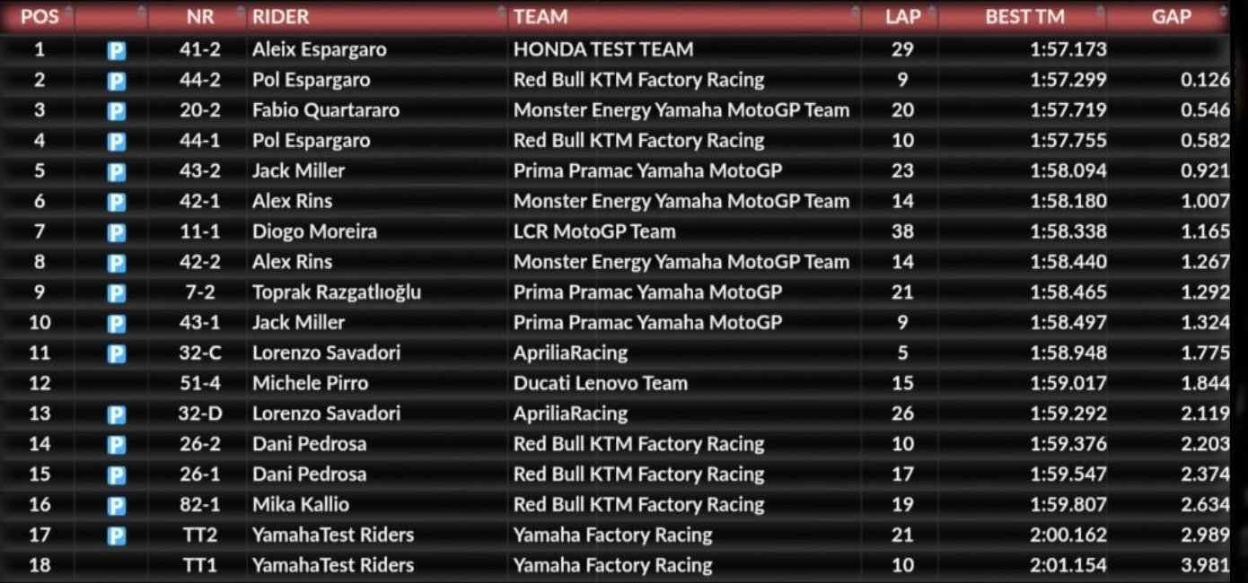 Jeudi, journée réservée aux pilotes d’essai et aux rookies, Aleix Espargaro (Test Team Honda HRC) s’est révélé le plus rapide devant son frère Pol (Test Team KTM), en 1’58.091.