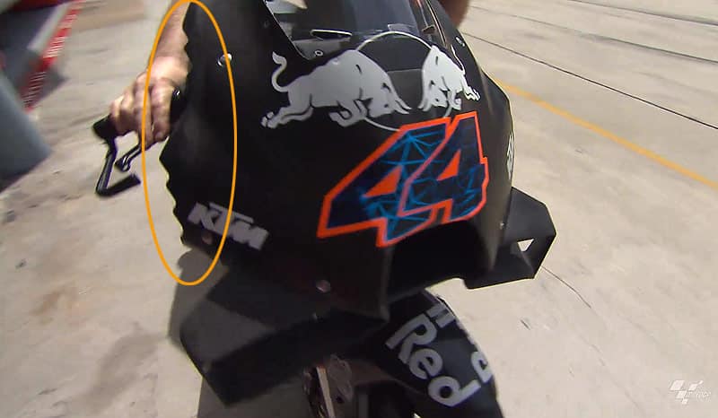 KTM n’échappe pas à la règle et Pol Espargaró a essayé lundi une prise d’air plus grosse et plus verticale, à l’image de Ducati, Yamaha et Aprilia, ainsi que des ailerons biplans ressemblant à ceux des Honda et des Suzuki…