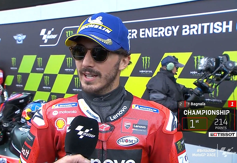 A peine descendu de sa Ducati GP23 officielle après avoir terminé 2e du Grand Prix MotoGP de Grand-Bretagne à Silverstone, Francesco Bagnaia s’est confié devant les caméras du site officiel MotoGP.com avec la satisfaction d’avoir marqué de gros points au championnat après un samedi difficile…