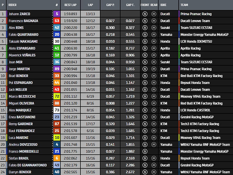 La hiérarchie est alors composée de Maverick Vinales, Alex Rins, Takaaki Nakagami, Aleix Espargaro, Marco Bezzecchi, Miguel Oliveira, Alex Márquez, Jorge Martin, Johann Zarco, Jack Miller, Brad Binder, Raul Fernandez, Pol Espargaro, Enea Bastianini, Joan Mir, Remy Gardner, Andrea Dovizioso, Luca Marini, Francesco Bagnaia, Franco Morbidelli, Stefan Bradl, Fabio Di Giannantonio, Darryn Binder et Fabio Quartararo.