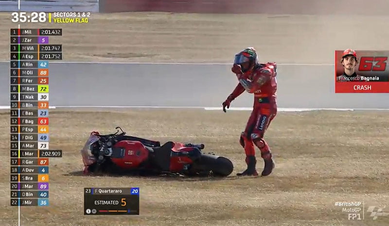 Encore un tour et Jack Miller est en 2’01.432 devant Johann Zarco, Maverick Vinales et Aleix Espargaro tandis que que Francesco Bagnaia part à la faute à grande vitesse au virage #4.