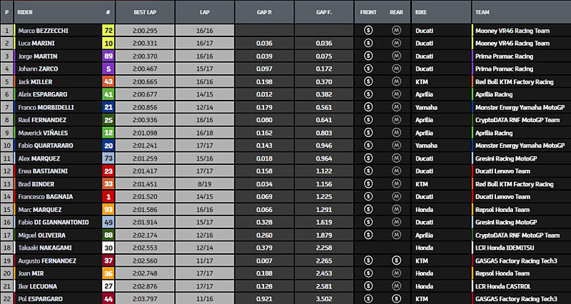 Après ce premier run, la hiérarchie est composée de Marco Bezzecchi, 36/1000 de seconde devant Aleix Espargaro, puis Luca Marini, Alex Márquez, Brad Binder, Jack Miller, Fabio Quartararo, Maverick Vinales, Johann Zarco, Franco Morbidelli, Jorge Martin, Miguel Oliveira, Raul Fernandez, Fabio Di Giannantonio, Marc Márquez, Enea Bastianini, Augusto Fernandez, Francesco Bagnaia, Joan Mir, Pol Espargaro, Iker Lecuona et Takaaki Nakagami qui n’a toujours inscrit aucun chrono.