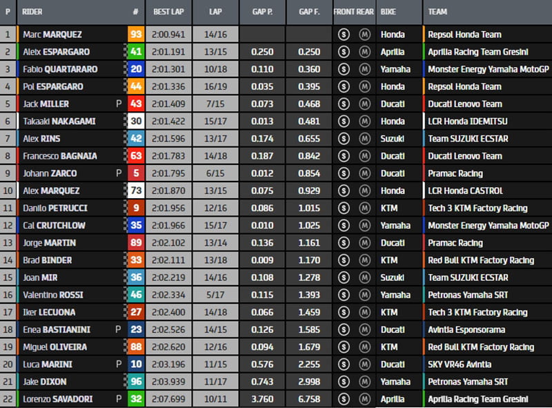 À la fin du premier run, la hiérarchie est donc composée de Marc Márquez, Takaaki Nakagami, Fabio Quartararo, Jack Miller, Pol Espargaro, Aleix Espargaro, Johann Zarco, Alex Márquez, Francesco Bagnaia, Valentino Rossi, Jorge Martin, Joan Mir, Brad Binder, Alex Rins, Iker Lecuona, Enea Bastianini, Danilo Petrucci, Luca Marini, Cal Crutchlow, Miguel Oliveira, Jake Dixon et Lorenzo Savadori. Les Honda sont là !