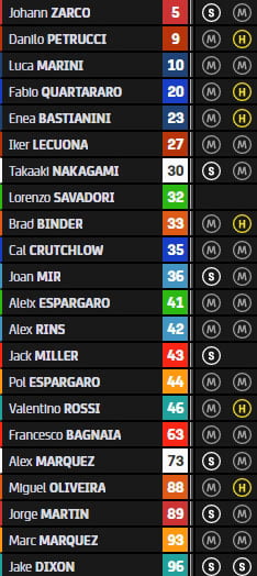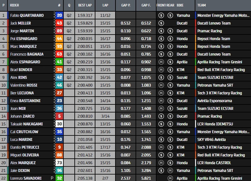 Au final, Fabio Quartararo, Jack Miller, Jorge Martin, Pol Espargaro, Marc Márquez, Francesco Bagnaia, Aleix Espargaro, Brad Binder, Alex Rins et Valentino Rossi sont pour le moment pré-qualifiés pour la Q2.