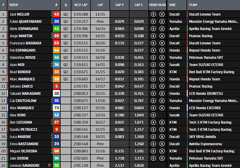 Au terme de la première journée, Fabio Quartararo, Jack Miller, Jorge Martin, Pol Espargaro, Marc Márquez, Francesco Bagnaia, Aleix Espargaro, Brad Binder, Alex Rins et Valentino Rossi se sont donc pré-qualifiés pour la Q2, contrairement à Johann Zarco enfermé dans une mauvaise stratégie. Pour le Français, il ne s’agira pas de rater cette dernière séance de 45 minutes pour tenter d’intégrer le top 10…