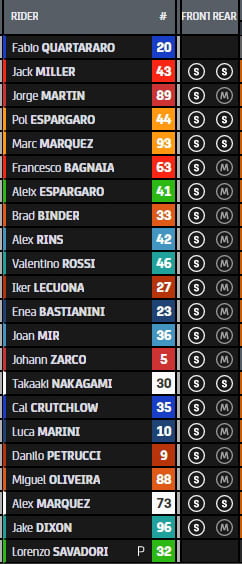Au niveau des pneumatiques, tout le monde utilise le tendre avant, et la plupart ont choisi le médium à l’arrière, à l’exception de Jack Miller, Pol Espargaro, Marc Márquez, Takaaki Nakagami et Alex Márquez qui ont opté pour le tendre.