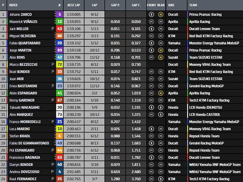 À la mi-séance, la hiérarchie est constituée de Jack Miller, Miguel Oliveira, Fabio Quartararo, Brad Binder, Maverick Viñales, Marco Bezzecchi, Jorge Martin, Álex Rins, Aleix Espargaró, Remy Gardner, Takaaki Nakagami, Enea Bastianini, Luca Marini, Alex Márquez, Stefan Bradl, Franco Morbidelli, Johann Zarco, Pol Espargaró, Francesco Bagnaia, Darryn Binder, Joan Mir, Andrea Dovizioso, Fabio Di Giannantonio et Raúl Fernández. Incontestablement, les KTM ont trouvé quelque chose…