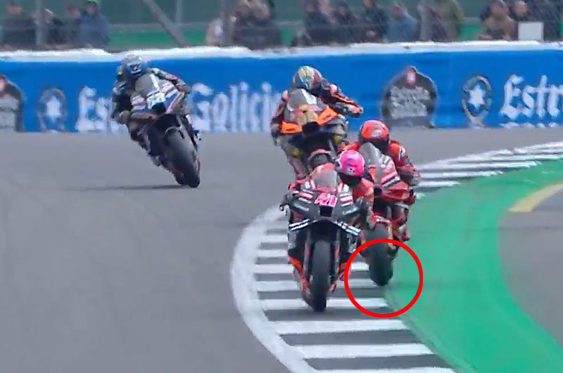 Les hommes en orange, en décortiquant les images de la course, sont en effet persuadés que le pilote Ducati est passé dans le vert dans le virage 15 (Stowe) et qu’en conséquence on aurait dû lui infliger la pénalité (de 3 secondes ou d’une place, on n’a toujours pas bien compris) prévue dans ce cas, ce qui aurait pour effet de classer Brad Binder 2e et Francesco Bagnaia 5e, à un moment où le championnat est loin d’être fermé…