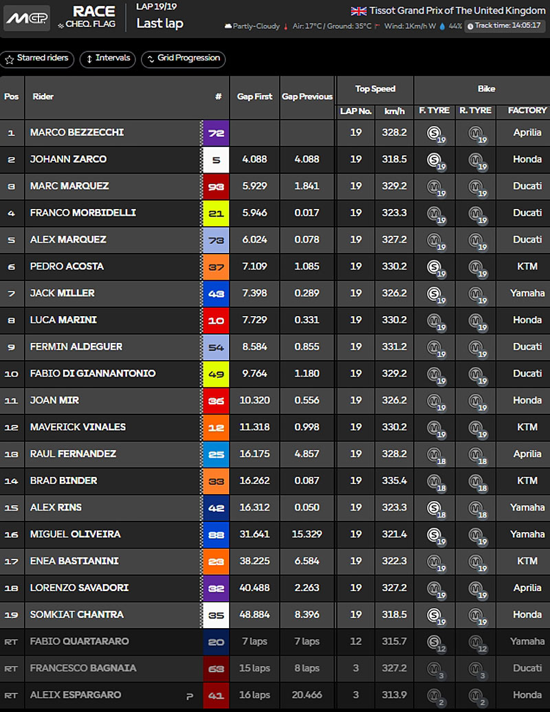 C’est dommage. Jack Miller était motivé pour cette troisième journée à Silverstone, mais il n’a pas pu convertir sa vitesse en gros points, malgré tous les incidents. L’Australien, dans la forme de sa vie lors des premiers tours, semblait se diriger vers un podium totalement inespéré, mais après quelques boucles, il devait déjà défendre ardemment sa position. Lui aussi a choisi le soft avant, mais ce choix ne s’est pas révélé payant. Il a passé la majeure partie de sa course à se faire doubler. Il peut quand même être fier de lui au vu du spectacle qu’il a proposé.
