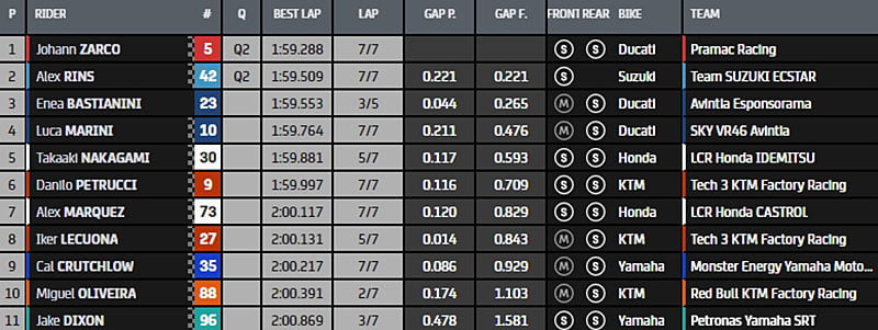 Sous le drapeau à damier, c’est Zarco qui claque un 1’59.288 devant Rins. Les deux sortent Bastianini. Place à la Q2 !