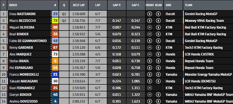Avec les quatre premiers sont en moins d’un dixième de seconde, la qualification s’annonce intense alors que Enea Bastianini et Marco Bezzecchi viennent de se repêcher en Q1 pour participer à cette séance de 15 minutes qui déterminera les positions sur les quatre premières lignes de la grille de départ.