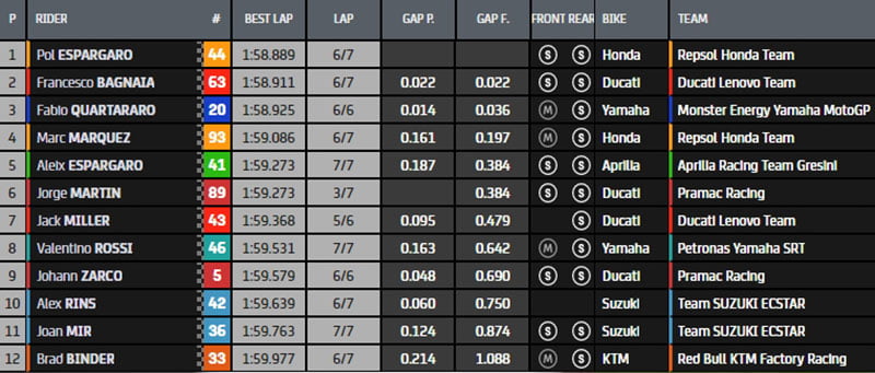 Au terme du premier run, Fabio Quartararo précède de 27/100 Francesco Bagnaia, Jorge Martin, Pol Espargaro, Jack Miller, Aleix Espargaro, Joan Mir, Valentino Rossi, Alex Rins, Brad Binder, Johann Zarco et Marc Márquez qui n’a toujours pas inscrit de chrono malgré 4 tentatives.