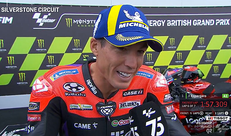 A peine descendu de son Aprilia RS-GP 24 officielle après avoir obtenu la pole position lors des qualifications du Grand Prix de Grande-Bretagne MotoGP 2024 à Silverstone, Aleix Espargaro s’est confié devant les caméras du site officiel MotoGP.com avec la joie d’obtenir sa 7e pole position en carrière sur le circuit où il a déjà gagné l’an passé …