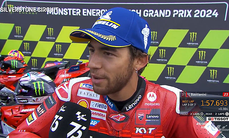 A peine descendu de sa Ducati GP24 officielle après avoir obtenu la 3e position lors des qualifications du Grand Prix de Grande-Bretagne MotoGP 2024 à Silverstone, Enea Bastianini s’est confié devant les caméras du site officiel MotoGP.com avec la satisfaction de se montrer de plus en plus souvent aux avant-postes…