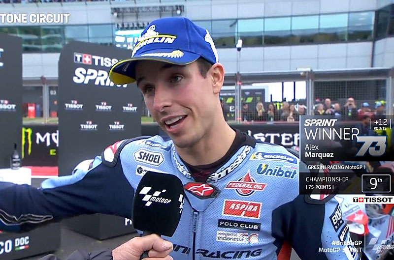 A peine descendu de sa Ducati GP22 de l’équipe Gresini Racing après avoir remporté le Sprint du Grand Prix de Grand-Bretagne à Silverstone, Álex Márquez s’est confié devant les caméras du site officiel MotoGP.com avec la joie de remporter sa première victoire en MotoGP, même si le Sprint n’est pas considérer comme un Grand Prix…
