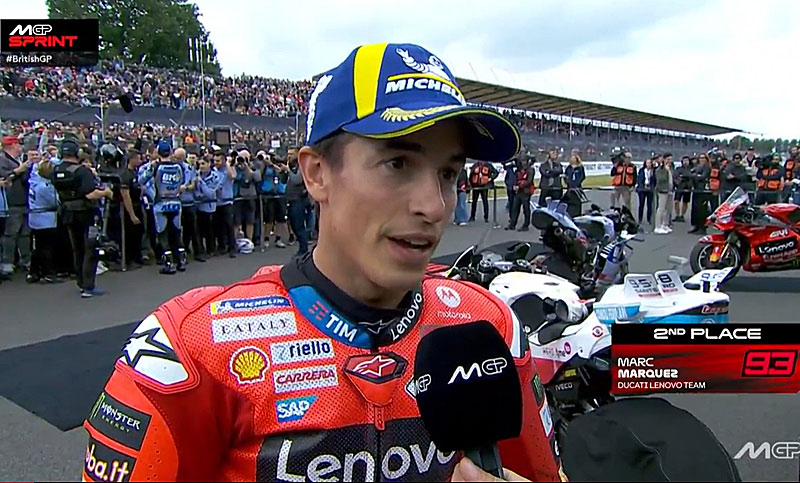 A peine descendu de sa Ducati GP25 du team d’usine Ducati Lenovo après avoir terminé 2e du Sprint du Grand Prix du Royaume-Uni MotoGP 2025 sur le circuit de Silverstone, Marc Marquez s’est confié devant les caméras du site officiel MotoGP.com avec la conviction d’avoir fait le maximum…
