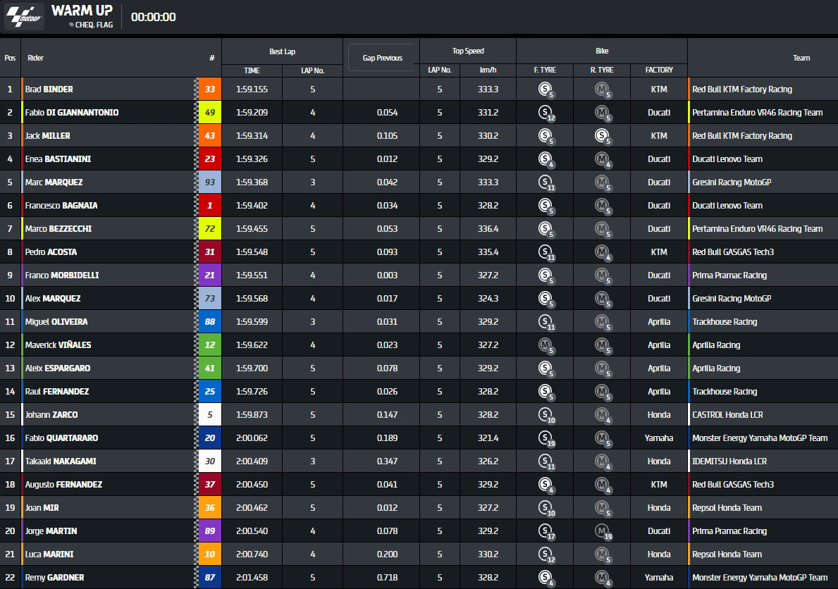 Classement du warm up MotoGP du Grand Prix de Grande-Bretagne 2024 à Silverstone :