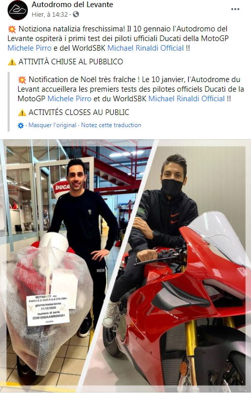Le 10 janvier, Michael Rinaldi pourra donc rouler sur une Panigale V4S, de série ou pas, et Michele Pirro sur ce qu’il veut : dommage que le circuit (très basique) soit fermé au public, car des photos seraient intéressantes !