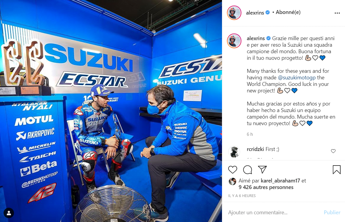 Alex Rins n’a pas été en reste en mentionnant sur son ex-patron : « un grand merci pour ces années qui a fait de Suzuki Champion du Monde. Bonne chance pour ton nouveau projet ! ». Brivio a ajouté en écho : « merci à toi Alex ! Marci pour ton travail ces dernières années et d’avoir ramené à Suzuki des victoires après des saisons difficiles. Tu as le talent et l’envergure pour obtenir des résultats sans cesses meilleurs. Alors vas-y ! ». Fin de transmission …