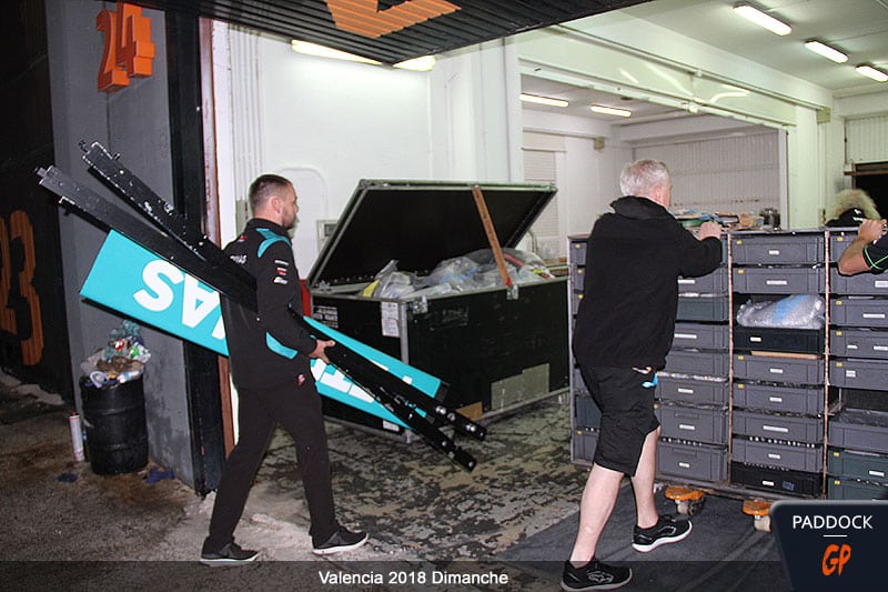 Au soir du dernier Grand Prix de la saison 2018, tous les éléments appartenant à l’équipe française d’Hervé Poncharal sont d’abord retirés du box sous la responsabilité de Guy Coulon : panneaux décoratifs, outillages, éclairages, moniteurs, etc, viennent peu à peu se ranger dans leurs « flying cases ».