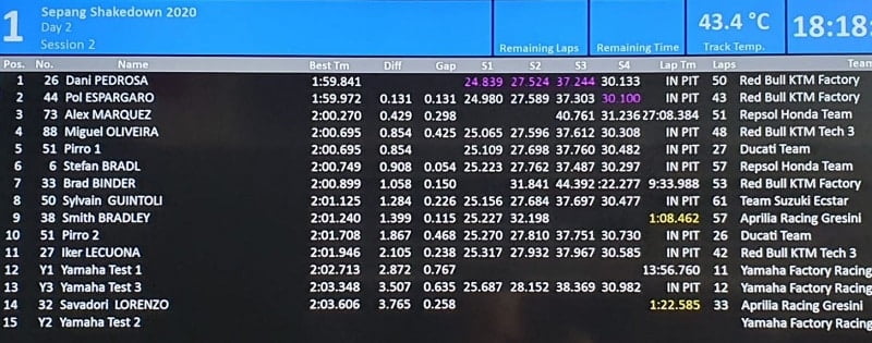 Tous les constructeurs présents pour ce « shakedown » malaisien disposent de plusieurs pilotes, à l’exception notable de Ducati dont la totalité de ces essais de déverminage sont effectués par l’unique Michele Pirro. Son rôle est d’autant plus important que les troupes de Luigi Dall’Igna sont détentrices du record absolu du circuit de Sepang, grâce à Danilo Petrucci.