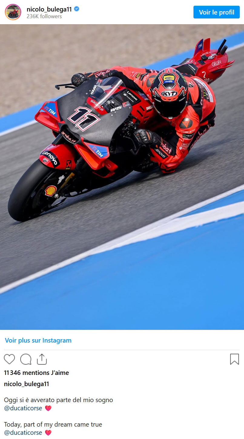 Aucune donnée officielle de temps n’a été révélée, même si un chrono de 1’38.00 a fuité. Mais les observateurs sont unanimes : l’essai a été positif. L’annonce officielle de l‘engagement de Bulega au Portugal et à Valence tombera prochainement.
