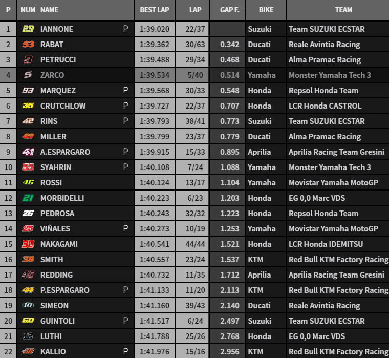 Juste après-midi, Andrea Iannone claquait un 1’39.020 qui le propulsait en tête devant Tito Rabat, Johann Zarco, Danilo Petrucci, Marc Márquez (ce dernier ayant subi une petite chute sans gravité) et Cal Crutchlow.