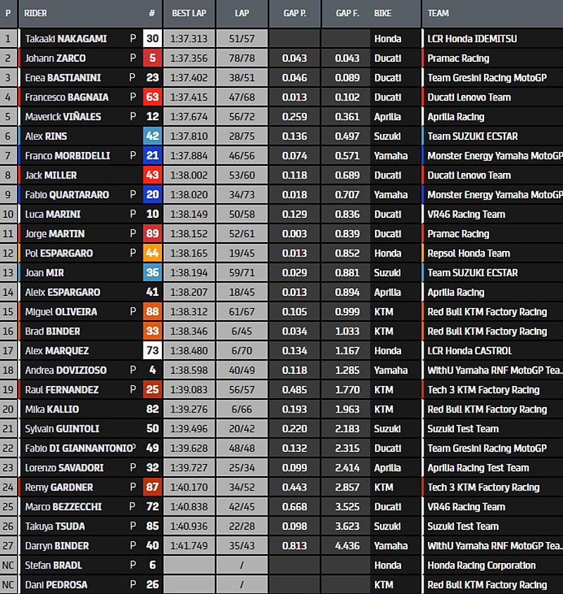 Enea Bastianini n’a pas mis longtemps à comprendre le fonctionnement de sa nouvelle GP21 qu’il a trouvée autrement plus agréable que sa précédente GP19. Et notamment sur un point qu’il faut d’ores et déjà prendre en compte pour 2022 : la mise en route pour la chasse au chrono. Il ne lui pas fallu beaucoup de tours pour claquer le troisième temps. Si le spécialiste des remontées Bastianini se met à partir des premières places sur la grille de départ l’an prochain, il sera sans nul doute à surveiller de près dans les Grands Prix à venir…