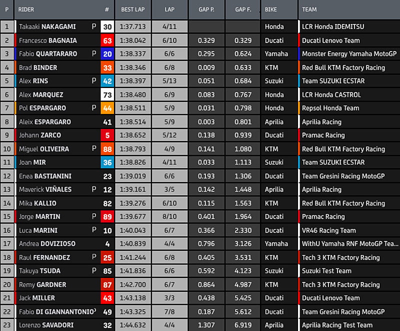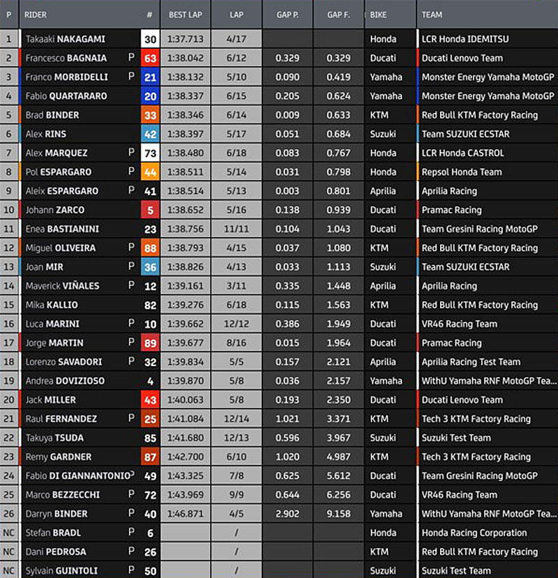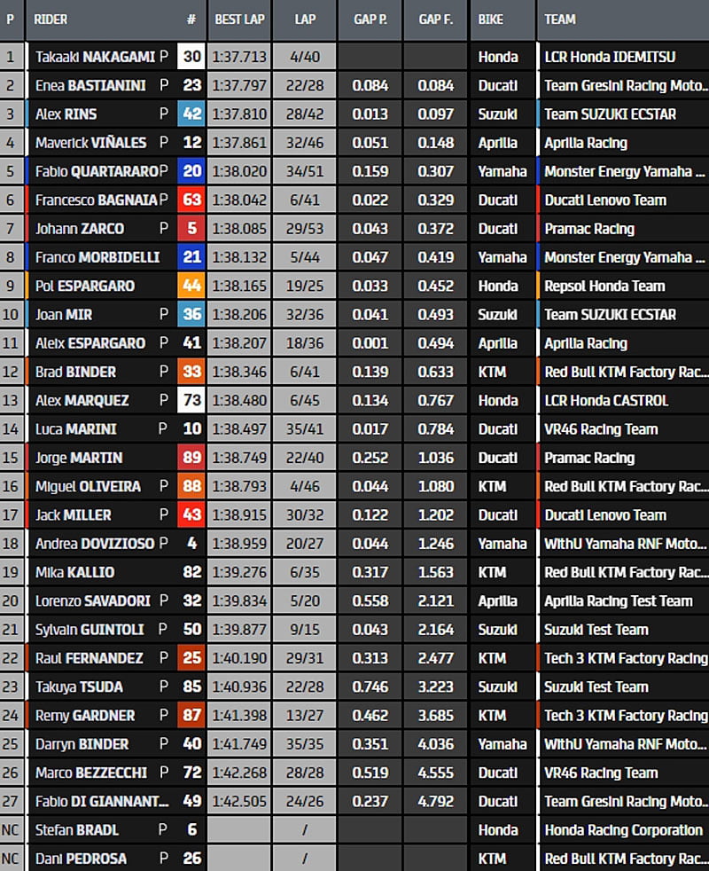 12h00 Le TOP 10 depuis le début de l’exercice : Nakagami premier avec 1’37.713, Bagnaia, Morbidelli, Quartararo, B. Binder, Rins, A.Marquez, P. Espargarò, A.Espargarò et Zarco.