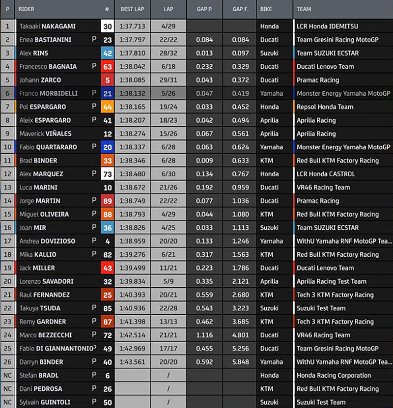 On ne sait pas encore pour les autres, mais le team Suzuki vient d’annoncer que ses pilotes communiqueront avec la presse ce soir et demain à la pause. Pour le moment, Alex Rins est troisième à 97 millièmes, Joan Mir 10e à une demi-seconde.