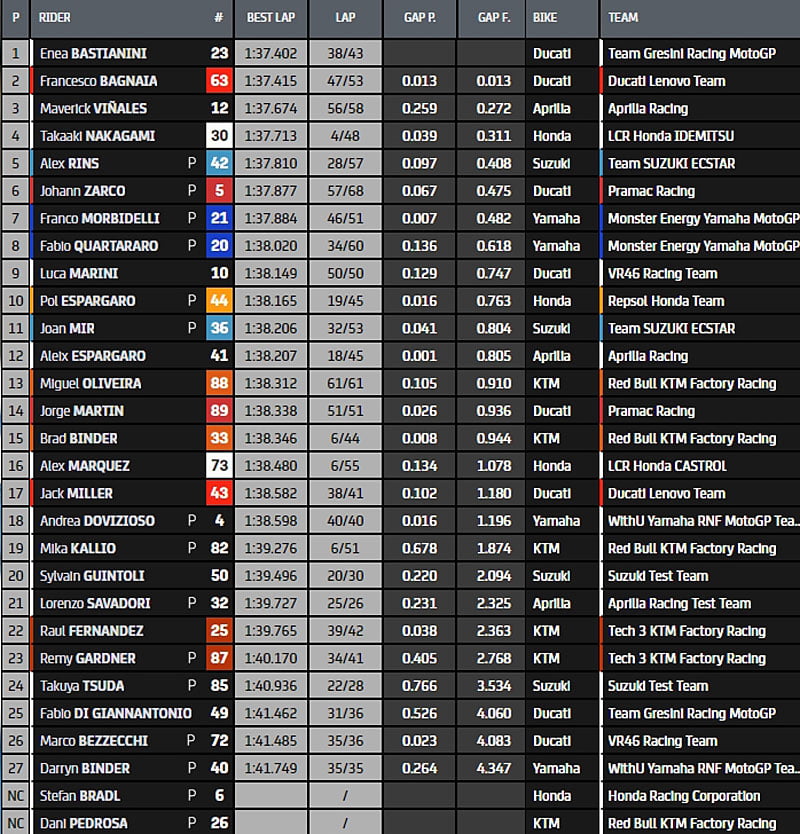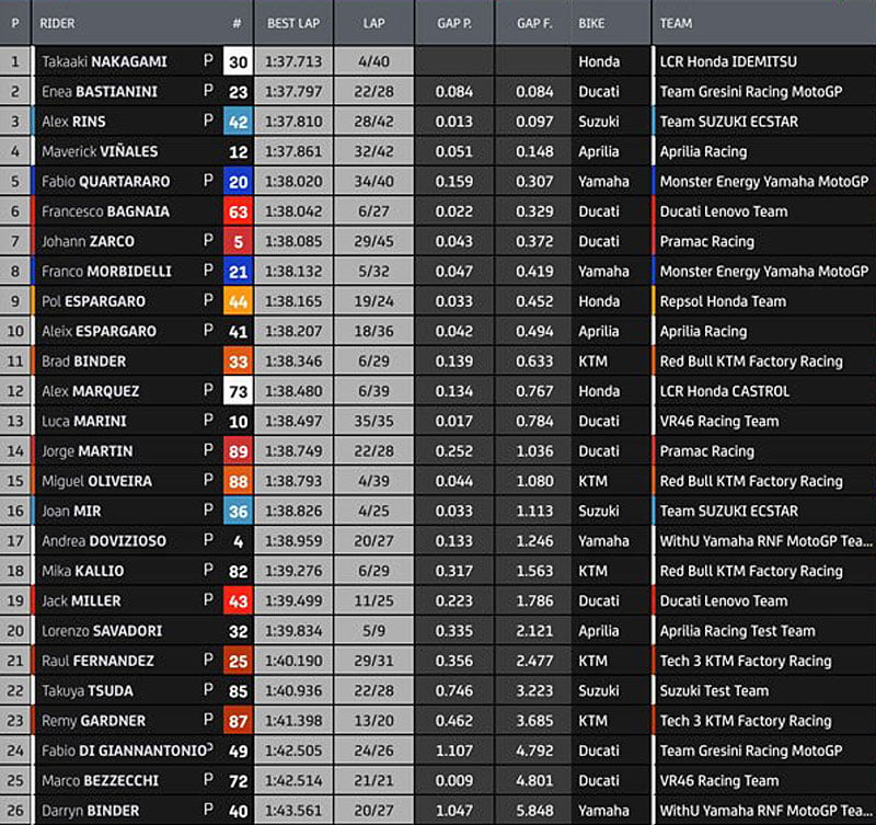 Nakagami, Mir, les frères Binder et Kallio les seuls en piste. Le journée s’achève. Et voici la hiérarchie de cette première journée de l’intersaison 2022…