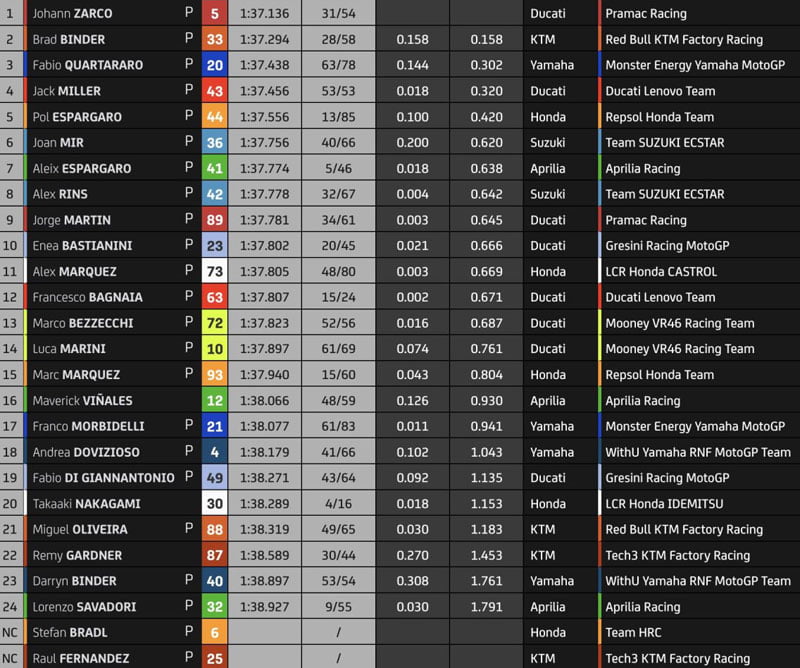 Le Top 10 est fermé par Alex Rins avec la Suzuki, Jorge Martin avec la Ducati Pramac et Enea Bastianini avec la Ducati Gresini. Pecco Bagnaia, le rookie Marco Bezzecchi et Luca Marini occupent respectivement les 12e, 13e et 14e positions, devant la Honda de Marc Marquez, cette dernière se détachant du sommet d’un peu plus de huit dixièmes. Franco Morbidelli (Yamaha Factory), Andrea Dovizioso (Yamaha WithU RNF) et le rookie Fabio Di Giannantonio ont terminé en 17e, 18e et 19e position.