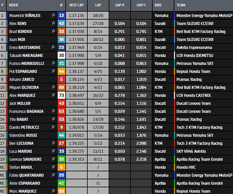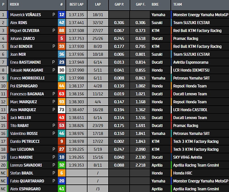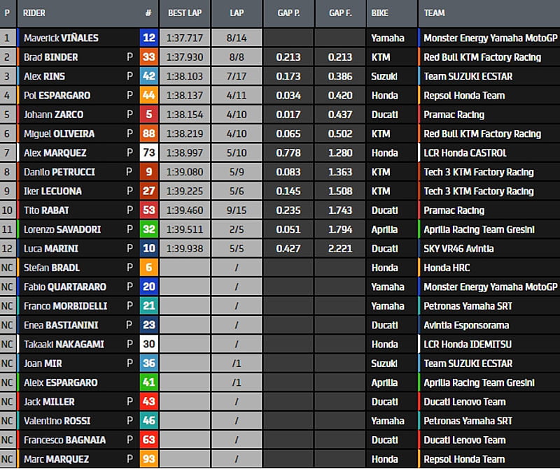 Au terme de la première heure, moment où Joan Mir et Aleix Espargaró s’élancent en piste, ils sont deux à avoir franchi la barre des 1’38, Maverick Viñales et Brad Binder, le pilote Yamaha inscrivant 1’37.717 en haut du classement provisoire, après un Grand Prix à nouveau un peu décevant hier.