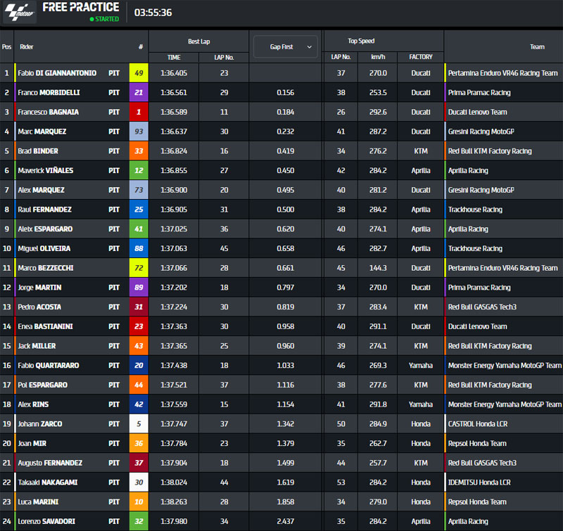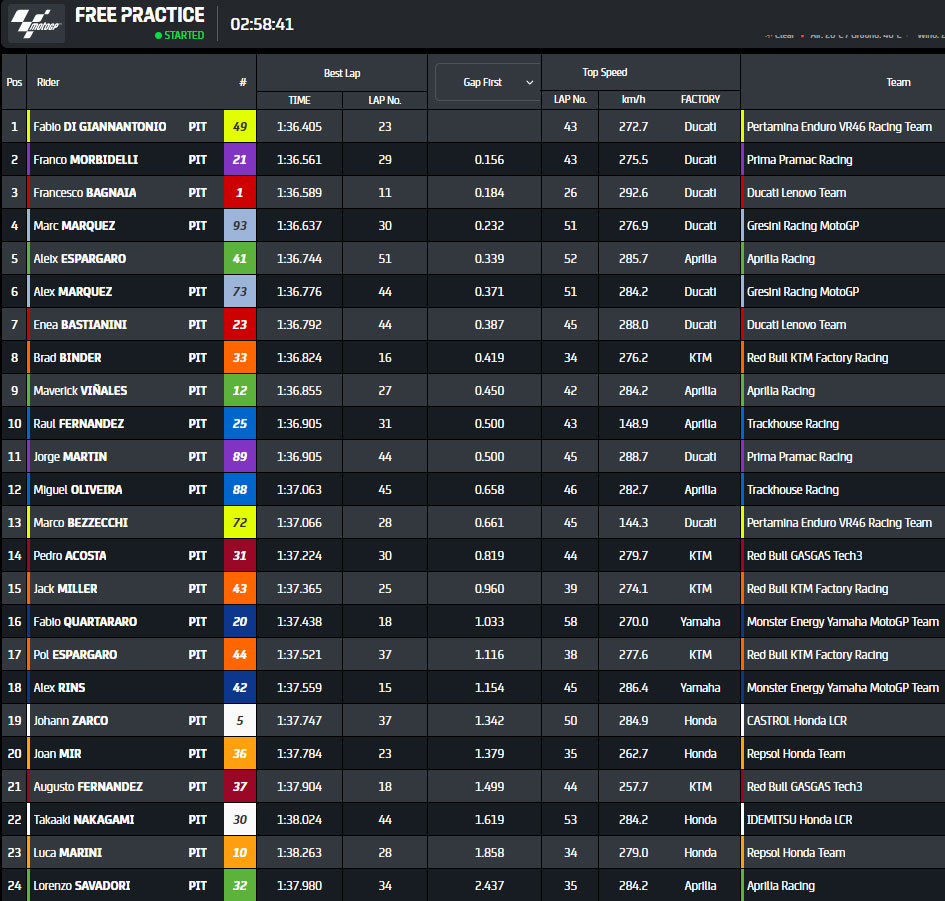 Ce matin (voir la séance ici), Fabio Di Giannantonio s’est montré le plus rapide en 1’36.405, très probablement en passant un pneu arrière tendre, même si contrairement aux week-ends de course, nous n’avons pas aujourd’hui cette indication sur le live timing.