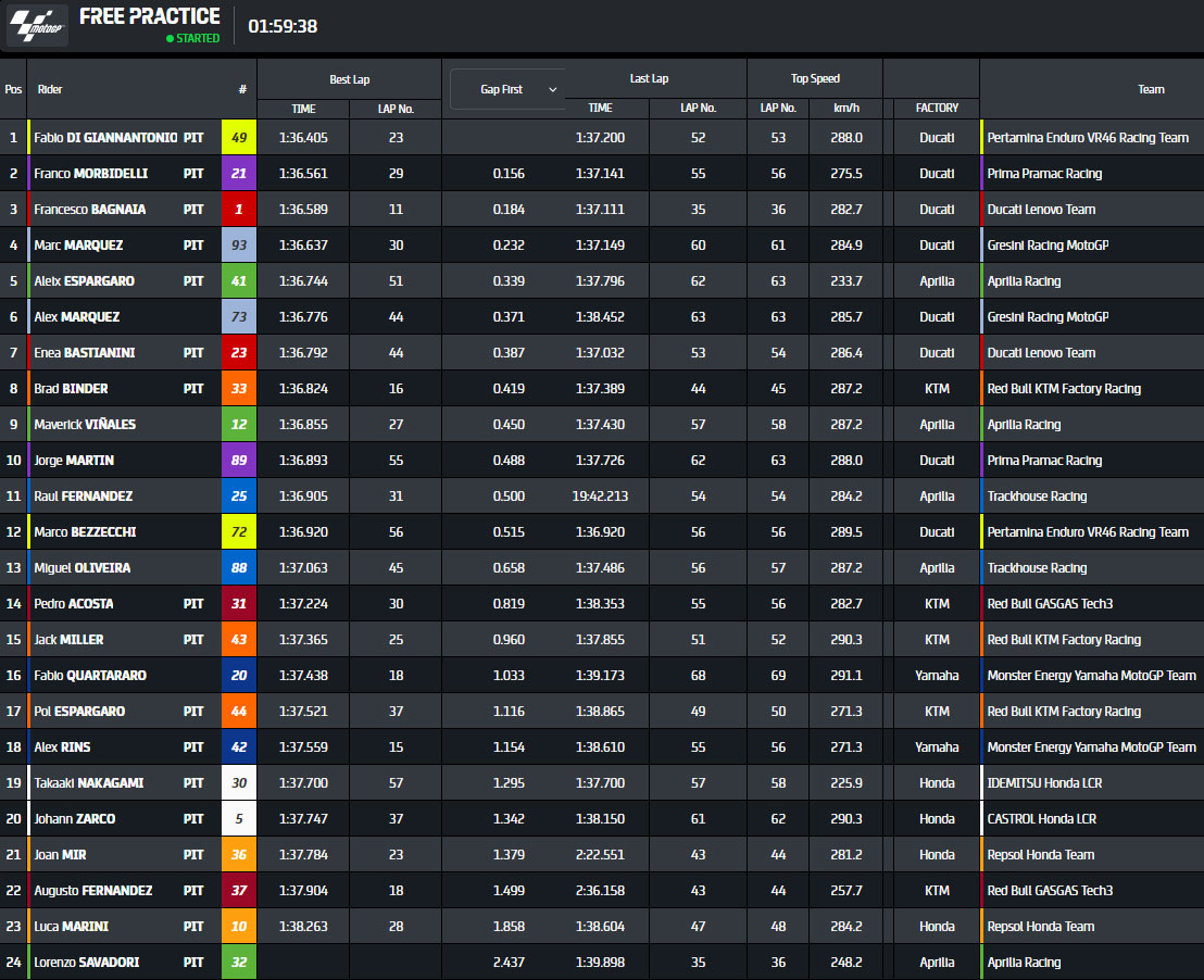 Comme vous le voyez, la quasi totalité des pilotes sont encore en train de déjeuner et, à l’heure où nous publions ces lignes, seuls Aleix Espargaro, Marco Bezzecchi et Enea Bastianini sont en piste.