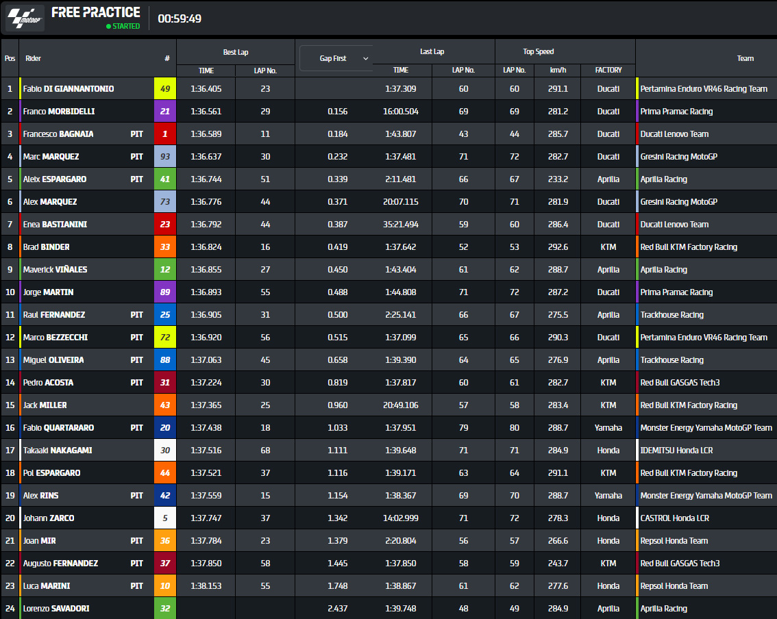Sprint Binder, Bagnaia, Miller (Voir ici) Martin, Acosta, Pedrosa (Voir ici)