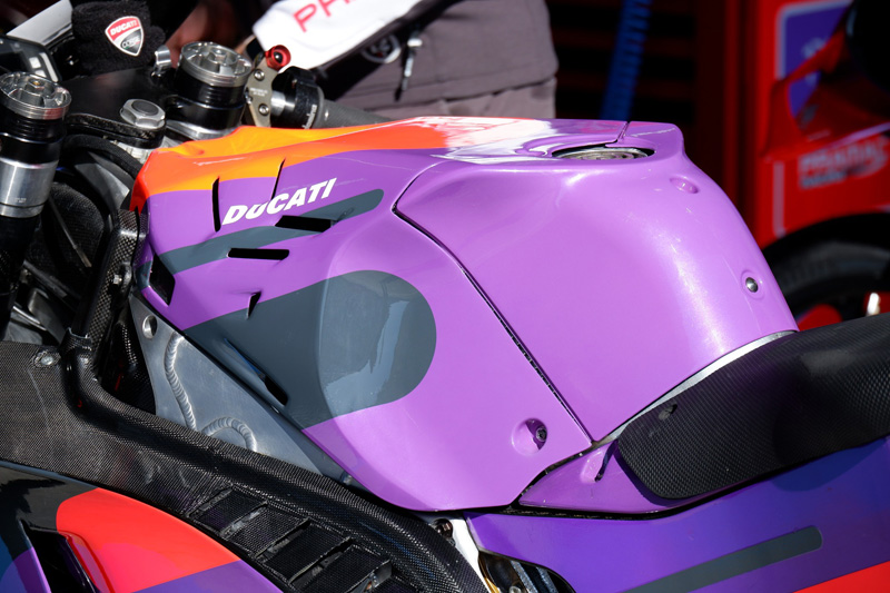 Son coéquipier, qui réalise là son premier jour de test après son absence aux essais hivernaux, peaufine sa position grâce à quelques éléments personnalisés sur sa Desmosedici GP24, comme ce cache-réservoir adapté à sa taille.