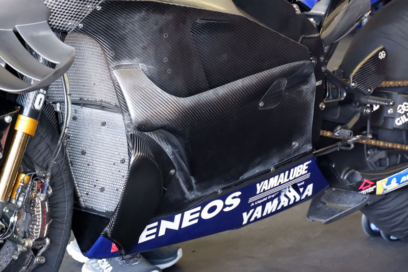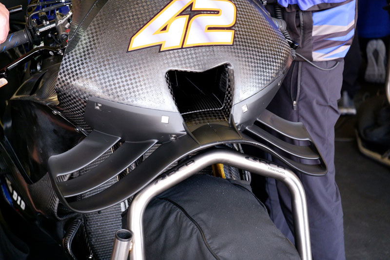 Pour le moment, Yamaha profite de cet avantage, Fabio Quartararo et Alex Rins ayant réalisé 63 et 50 tours sur leurs M1, aux nouveaux appendices aérodynamiques pour le #42 : aileron avant style Aprilia mais en version triplan, générateurs d’appui latéraux façon KTM.