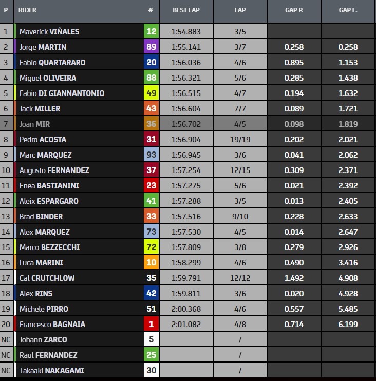 Après une première partie de journée monopolisée par KTM, le classement est désormais révolutionné à quelques minutes de la fin des deux heures d’essai : Martin est en tête devant Quartararo (Yamaha), Di Giannantonio (Pertamina VR46) , Mir (Honda) et Marc Marquez (Ducati Gresini). C’est le top 5 provisoire. Puis Maverick Viñales est le premier à descendre sous la barre des ‘:55 aujourd’hui : Maverick prend la tête du classement en devançant son Aprilia en 1’54.883.