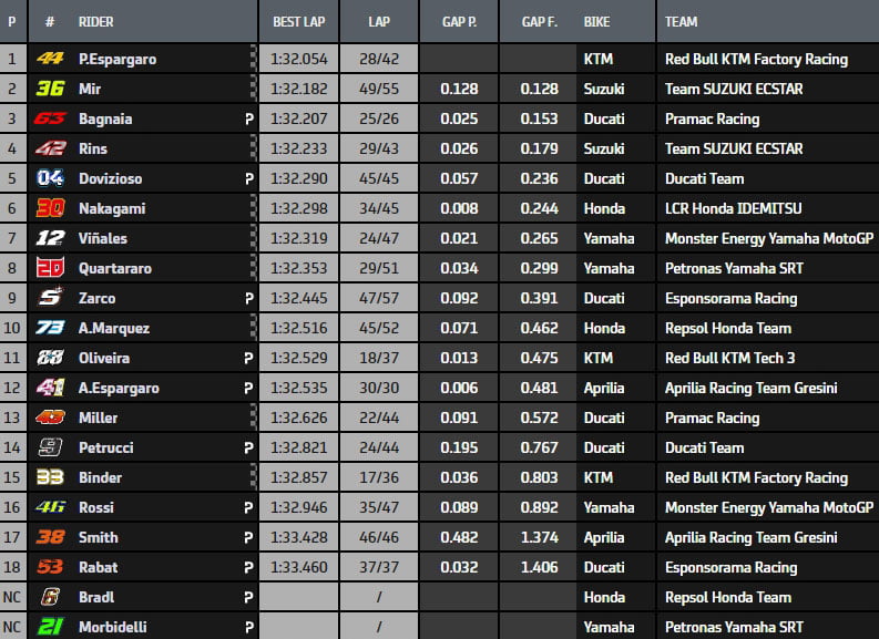Johann Zarco a alors pris le commandement en 1’32.163 avant d’être d’être débordé par le duo des Suzuki, tout d’abord Joan Mir pour un millième (!) puis par Álex Rins en 1’32.114.