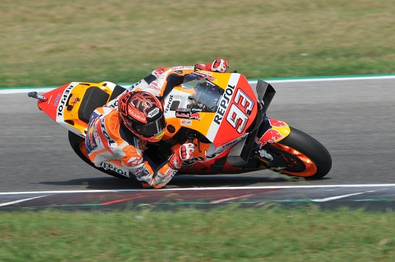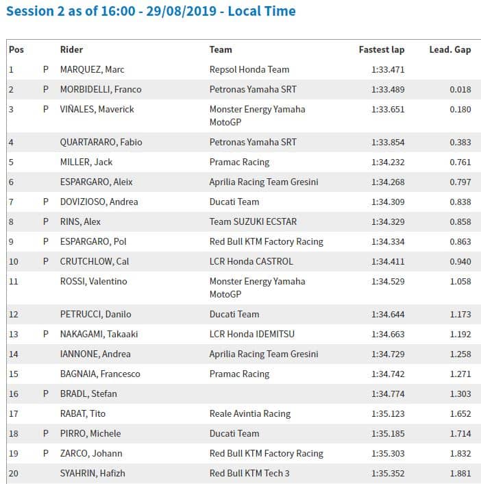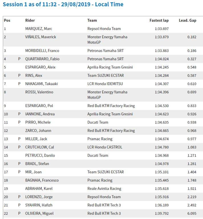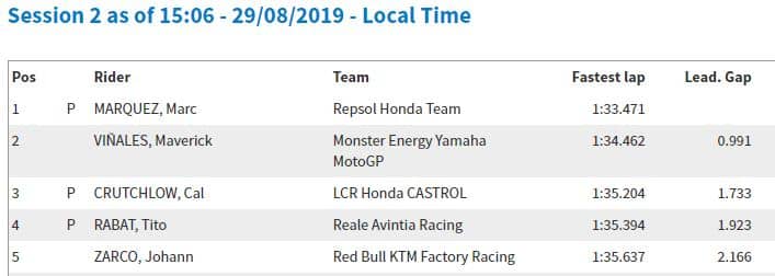 14h42 : Dès le début de séance, Marc améliorait en 1’33.471 le meilleur temps de Fabio Quartararo réalisé le matin en 1’33.539. Marquez utilisait alors pour ce faire le réservoir et la selle de la moto de Stefan Bradl.