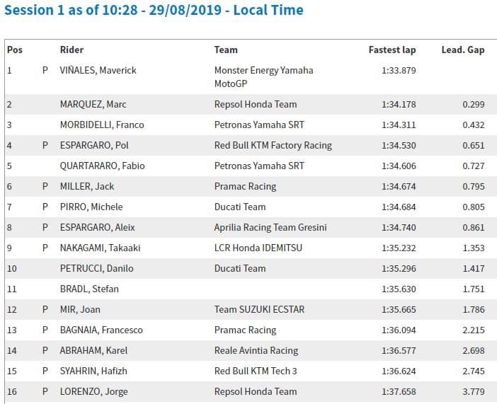 15h57 : Seuls Karel Abraham, Dani Pedrosa (pourtant inscrit par KTM) et Joan Mir ne tournaient pas.