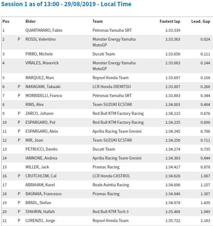 11h55 : Fabio Quartararo était le pilote qui avait le plus roulé jusque-là avec un total de 33 tours. Pour fêter ça, il réalisait le temps le plus rapide de la matinée en 1’33.539, 0.1 devant Michele Pirro et Marc Marquez. C’était bon chrono, compte tenu du fait que chez Michelin, on estimait la piste sale.