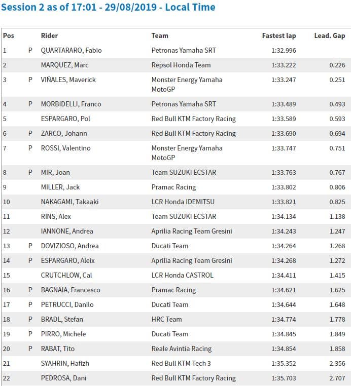 17h11 : Maverick Vinales s’emparait de la troisième place à 0.251 de Fabio et 0.025 de Marc, tandis que Pol Espargaro passait cinquième, 0.592 derrière Fabio et 0.102 devant son coéquipier Johann Zarco.