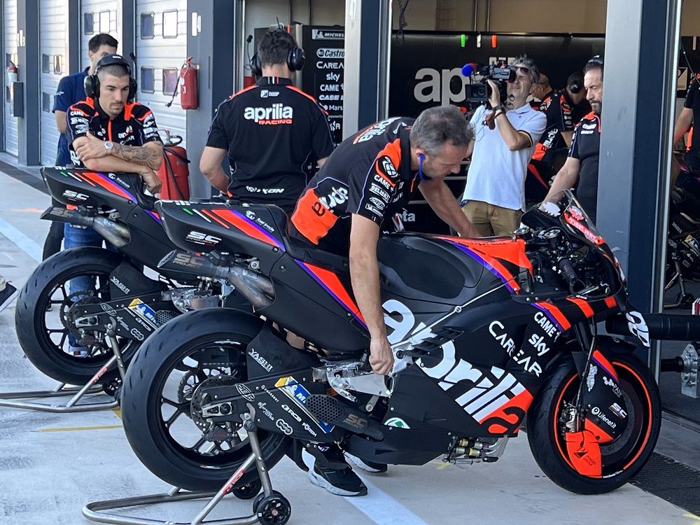 30 minutes après l’ouverture de la piste; les deux Aprilia officielles prennent la piste avec Vinales et Aleix Espargaró mais sans cadre carbone.